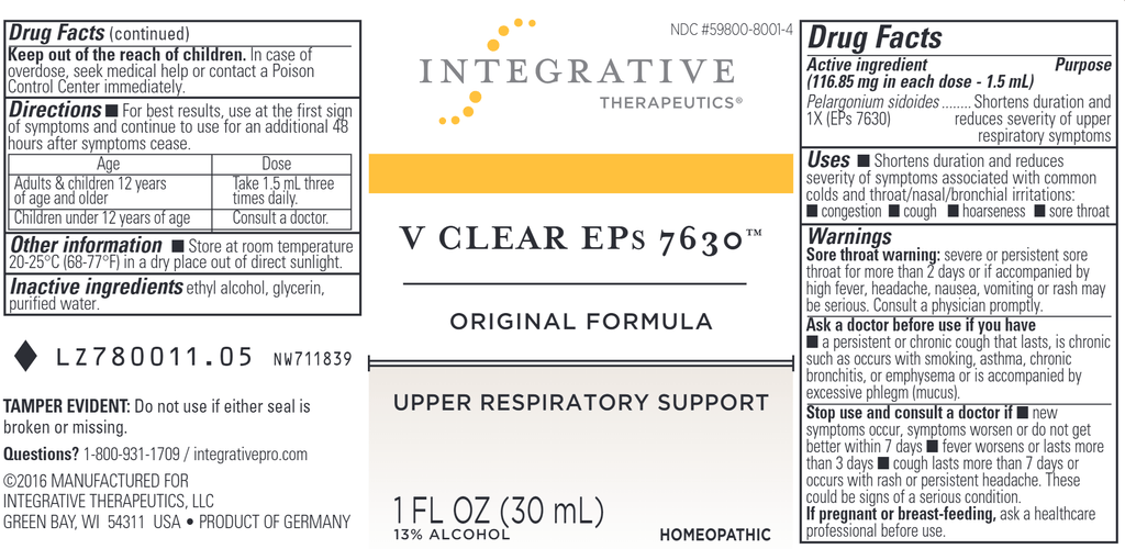 V Clear EPs 7630® is an upper respiratory treatment containing a proprietary, homeopathic preparation of Pelargonium sidoides extract (also known as African geranium). V Clear EPs 7630 addresses the underlying cause of symptoms to help speed recovery, and shorten the duration of upper respiratory irritations.†