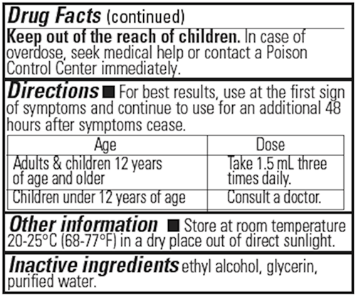 For best results, use at the first sign of symptoms and continue to use for an additional 48 hours after symptoms cease. Adults and children 12 years of age and older: Take 1.5 mL three times daily. Children under 12 years of age: Consult a physician.