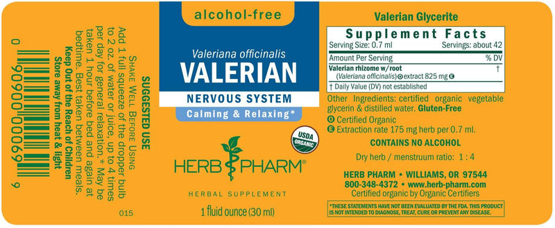 Herb Pharm prepares Valerian Glycerite from the rhizome and root of Valeriana officinalis plants. The rhizome & roots are harvested in both autumn and spring.