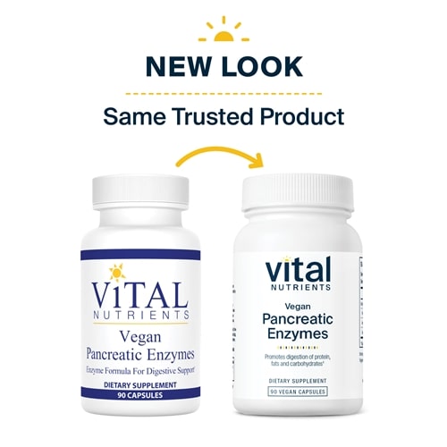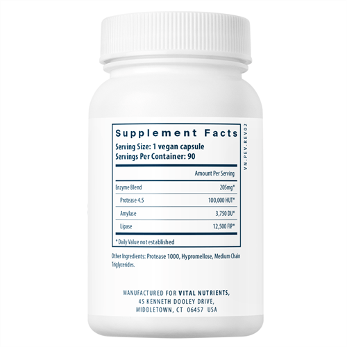 Vital Nutrients Vegan Pancreatic Enzymes provide lactose-free, dairy-free, gluten-free, vegan digestive enzymes. This new formula features a complete blend of highly-active protease, lipase, and amylase enzymes. These enzymes work synergistically, over a broad pH range. Their activity begins in the stomach and continues all the way through the small intestine for complete digestive support.*
