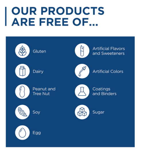 Free of gluten, dairy, peanut, tree nut, soy, and egg. Free of artificial flavors, colors, sweeteners, excipients (fillers, coatings, binders), sugar and non-GMO