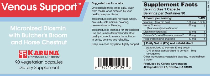 Venous Support contains clinically-studied botanical and flavonoid combinations to support the connective tissue integrity of veins and capillaries. Optimal function of the venous circulatory system is essential for controlling fluid balance within the tissues of the upper and lower extremities, and to maintain normal volume of the leg and hemorrhoidal veins. Horse Chestnut Seed Extract contains escin, and Butcher's Broom contains ruscogenins; these saponins are responsible for effects on vascular tone and permeability. The flavonoids diosmin and hesperidin, often combined with vitamin C, also have important influences on vascular connective tissue.*