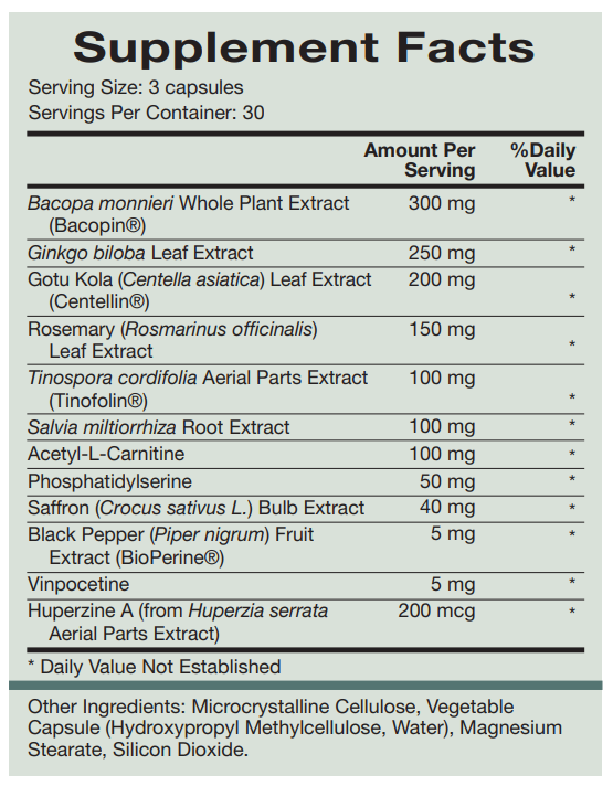 Vibrant Mind® contains an array of highly concentrated botanical extracts and advanced nutrients which work to promote healthy neurological function and mental acuity. Standardized extracts of classic brain tonic herbs such as Bacopa, Gotu Kola, and Ginkgo have been combined with brain-specific compounds phosphatidylserine, huperzine A, vinpocetine and acetyl-L-carnitine. These select ingredients provide multi-targeted mechanisms to support healthy brain oxygenation, mitochondrial function and cholinesterase activity, while encouraging proper oxidant and cytokine balance.*