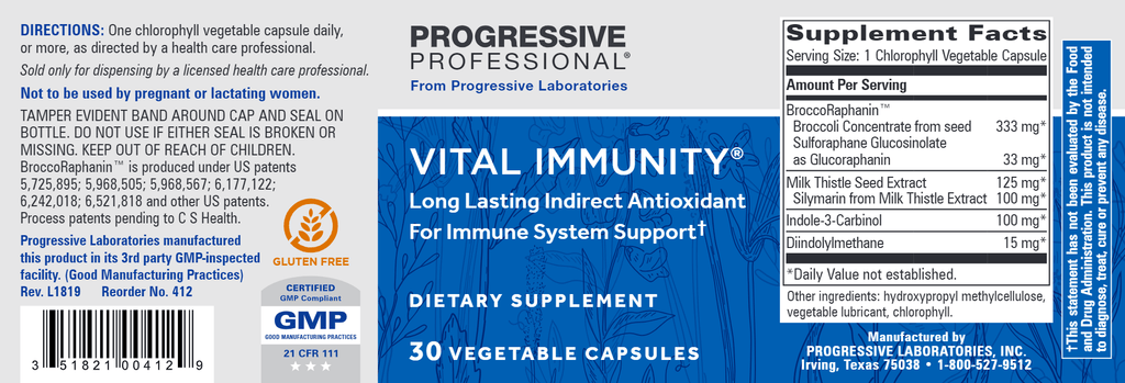 Vital Immunity combines the long-lasting indirect antioxidant effects of BroccoRaphanin Broccoli seed extract with indole-3-carbinol (IC3), diindolylmethane (DIM) and milk thistle for immune support, hormone balance and liver health.