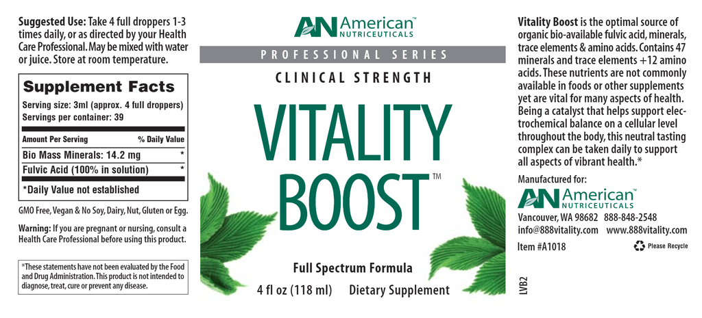 Vitality Boost is a liquid mineral complex that contains the most easily digestible and bioavailable organic mineral complexes and amino acids available. A rich source of fulvic acid is thought by leading natural health experts to be one of the most important missing links in the modern food chain. Fulvic acid mineral complexes can improve energy function, increase assimilation, stimulate metabolism, support electrochemical balance, enhance nutrients and support the immune system. With Vitality Boost’s antioxidant and cleansing properties, this neutral tasting mineral complex can be taken daily to support body functions.