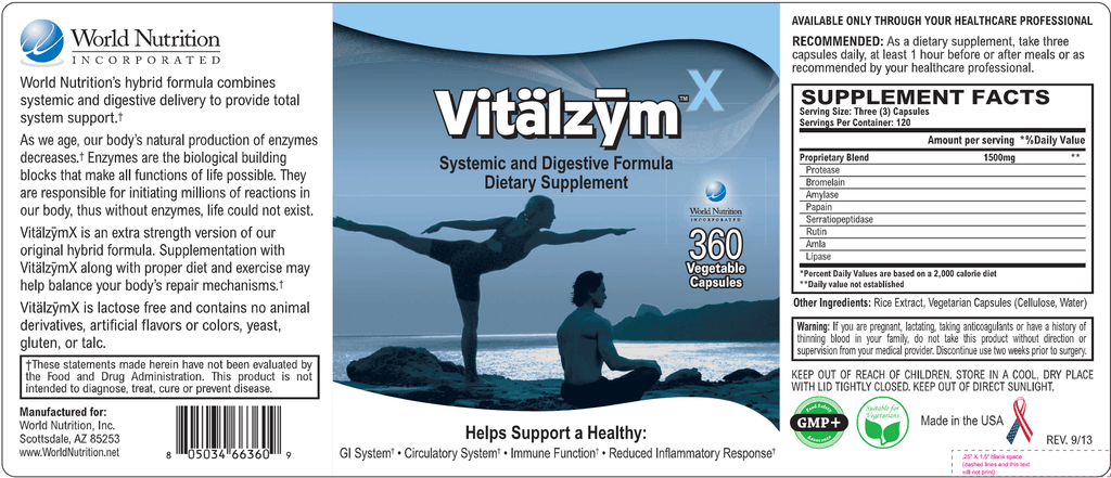 World Nutrition's hybrid formula combines systemic and digestive delivery to provide total system support.* Enzymes are needed for each biochemical reaction that makes life possible. As we age, our body's natural production of enzymes decreases. Supplementation with Vitalzym X, along with proper diet and exercise, may help to maintain normal enzyme levels.* Vitalzym X contains no animal derivatives, artificial flavors, yeast or gluten. Vitalzym X is also lactose free and contains no talc.