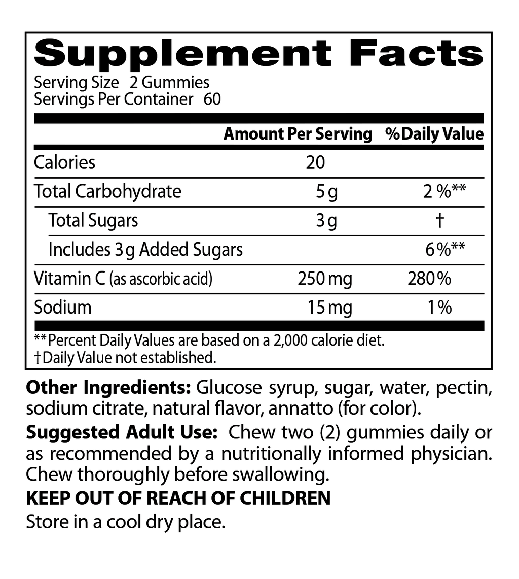 Two gummies contain 250 mg of Vitamin C. Chew two gummies daily.
