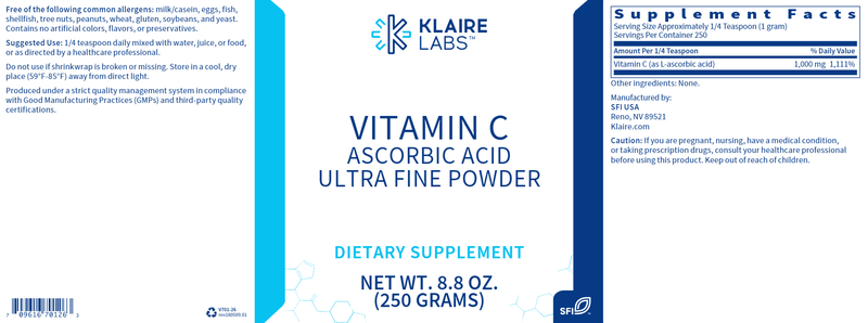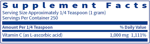 Vitamin C supports immune system function and tissue repair, acts as a powerful antioxidant protecting cells from free radical damage, and is important for production of collagen and other connective tissues. This exceptionally pure, ultra-fine unbuffered vitamin C powder contains no added ingredients.