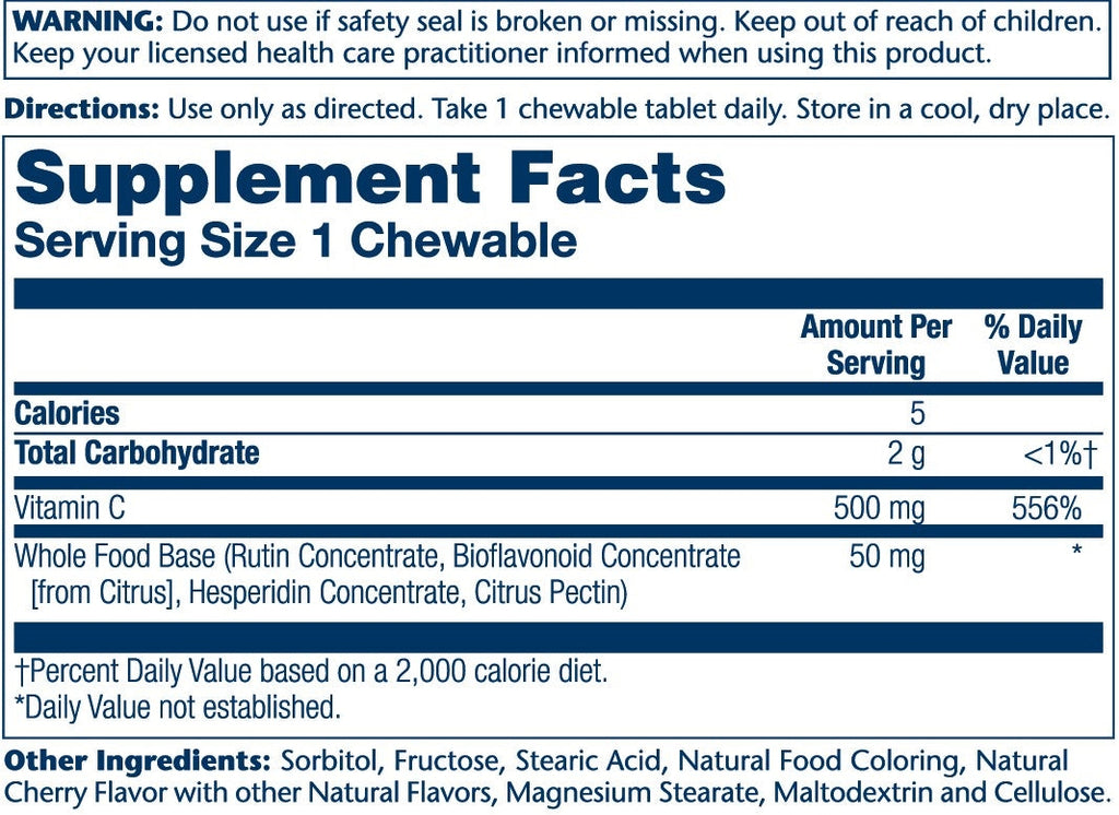 Solaray™ Vitamin C Chewable Wafers provide antioxidant activity. Solaray Vitamin C Chewable Wafers are intended to provide nutritive support for normal, healthy collagen synthesis, cartilage and bone development, immune function, capillary and blood vessel integrity, healthy skin and nerve impulse transmission.*