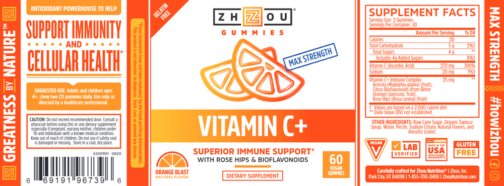 Vitamin C+ gets an A+ in Zhou's book. Most know vitamin C for its immune supporting powers, but it’s also a vital part of collagen production, which supports healthy and vibrant skin. Immune health can have a big influence on your overall wellness, and the unique blend of vitamin C, rosehips, acerola, and bioflavonoids in Vitamin C+ can support your gut and your skin simultaneously (I mean WOW, that’s a good looking report card). Zhou's vegan, Non-GMO gummies are made with NO artificial colors, flavors, or artificial preservatives. So whether you’re taking them yourself or sharing them with your little ones, you can trust that you’re fueling your body with high quality, natural ingredients.