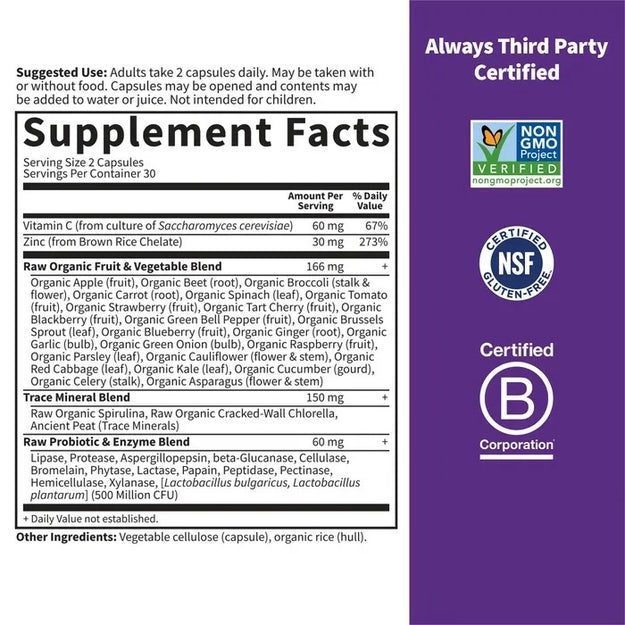 Vitamin Code Raw Zinc is whole food nutrition, specifically formulated to provide 30mg of high-potency zinc (273% of the Daily Value) plus 60mg of vitamin C. Twenty-three powdered organically grown fruits and vegetables, plus 75 alkalizing trace minerals, add supporting antioxidants, vitamins and nutrient cofactors. Raw means no high heat, synthetic binders or fillers, artificial flavors, sweeteners, colors or additives commonly used in tablets. Vitamin Code Raw Zinc supports immune system health, skin and eye health, prostate health and has live probiotics and enzymes to support healthy digestion.