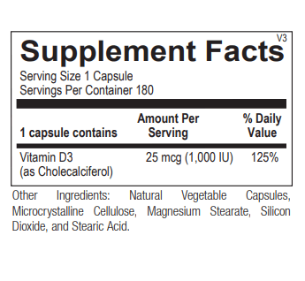 The Vitamin D 1,000 IU formulation is delivered as D3 (cholecalciferol) for optimal absorption in the body.