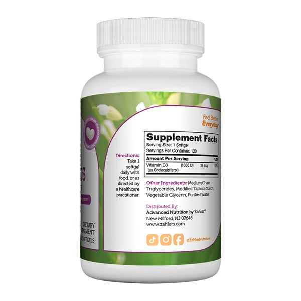 Zahler's Vitamin D3 Softgels 1000 IU is known to promote immunity, bone health and general wellness.