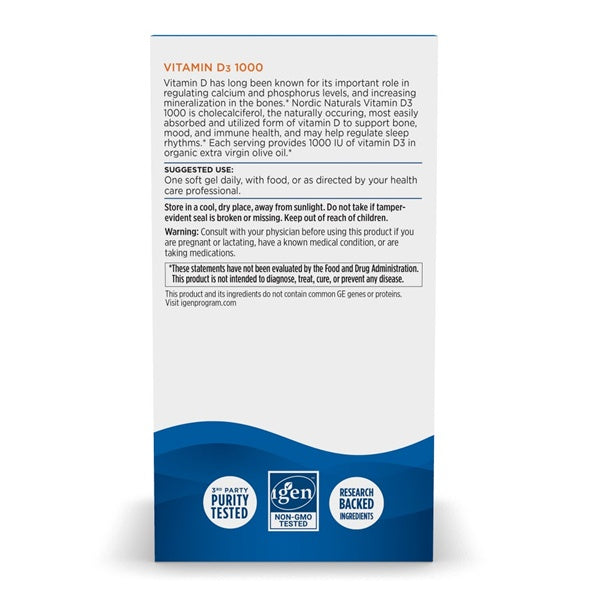 Long known as an essential bone-building nutrient, vitamin D3 also plays a role in regulating your immune system, and modulating mood and circadian rhythms.* Many people don't get enough vitamin D, either because they routinely wear sunblock, spend more time indoors, have darker skin, or live up North. Our Vitamin D3 1000 formula helps you meet your daily needs with 25 mcg (1000 IU) of natural vitamin D3.