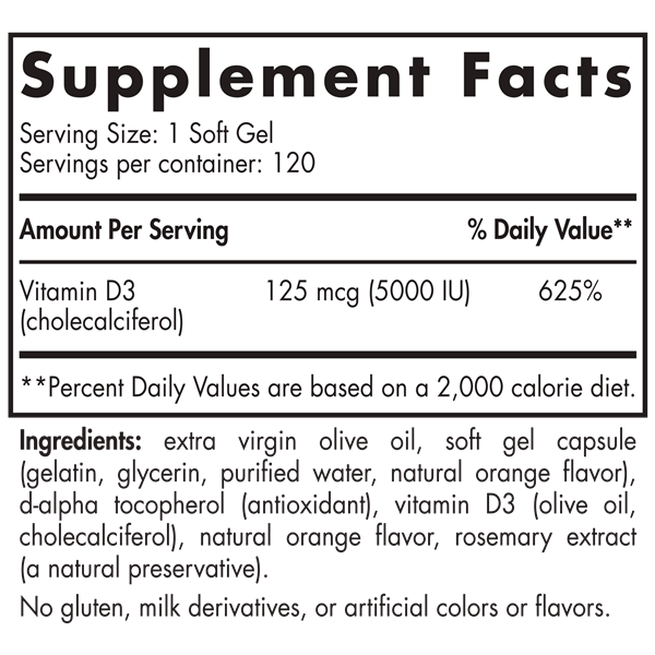 Replenish your body's stores of vitamin D3 with 125 mcg (5000 IU) of natural vitamin D3 in just one mini soft gel.