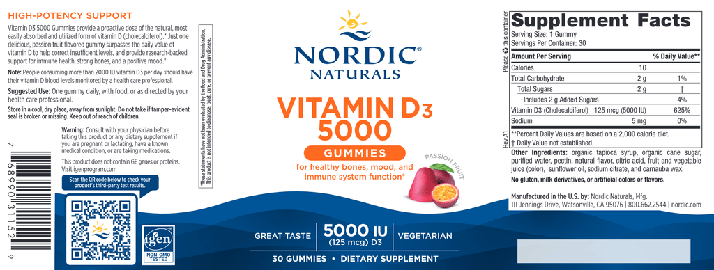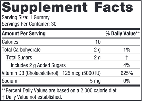 Vitamin D3 5000 Gummies helps replenish insufficient vitamin D levels with a substantial serving of easily absorbable vitamin D3 (cholecalciferol) in just one tasty gummy.