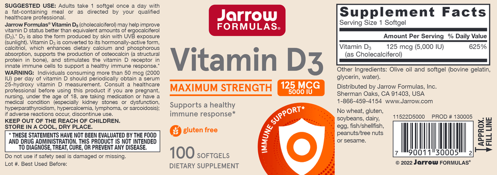 Jarrow Formulas® Vitamin D3 provides cholecalciferol, which is the form produced by the (human) skin in response to UVB exposure (sunlight) and may also improve vitamin D status better than equivalent amounts of ergocalciferol (D2). Vitamin D3 is ultimately converted to its hormonally-active form, calcitriol, in the body as needed. Calcitriol enhances dietary calcium and phosphorous absorption, supports the production of osteocalcin (an important structural protein in bone), and supports a healthy immune response.