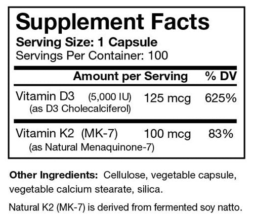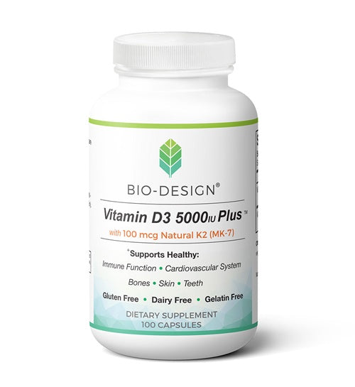 Vitamin D3, known as the sunshine vitamin, is important for many critical body functions, including bone health, immunity, cardiovascular health, mood support, and already healthy blood sugar levels.* Unfortunately, low vitamin D levels are common today and restoring healthy levels are crucial to overall health. Bio-Design’s Vitamin D3 5,000 Plus contains 5,000 international units of vitamin D-3 and also includes the natural form of vitamin K2, menaquinone-7 (MK-7). Bio-Design’s MK-7 is a soy-free source. The vitamin K2 as MK-7 helps support healthy arterial flexibility.* This unique combination of vitamins D3 and K2 (MK-7) plays a critical role in directing calcium from the bloodstream to bone mass, where it is needed most.*