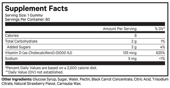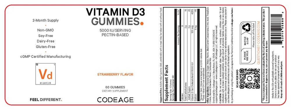 Codeage Vitamin D3 Gummies provide 125 mcg of vitamin D3 5000 IU per serving. The vitamin D3 in this dietary supplement is derived from cholecalciferol, to provide an advanced form of vitamin D. These chewable gummy vitamins are gelatin-free, meaning the gelling agent used in the formula has been sourced from fruits or plants, NOT from animal gelatin. Their delicious berry shaped vitamin D3 gummies come in a delightful texture and natural strawberry flavor. This vitamin D3 gummy supplement is designed for both men and women.