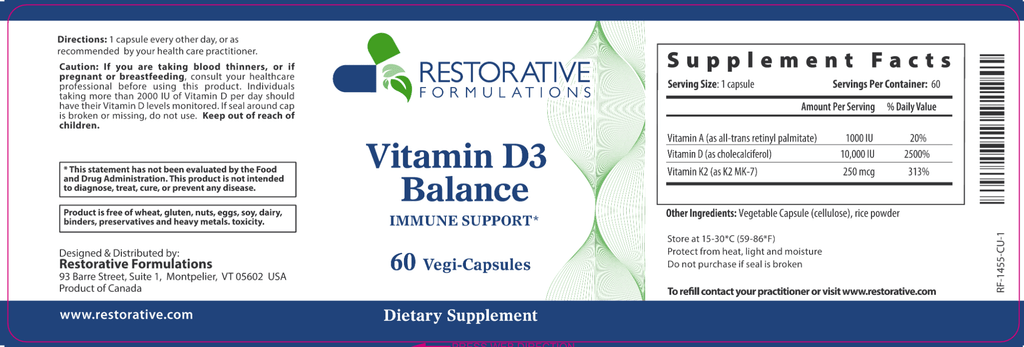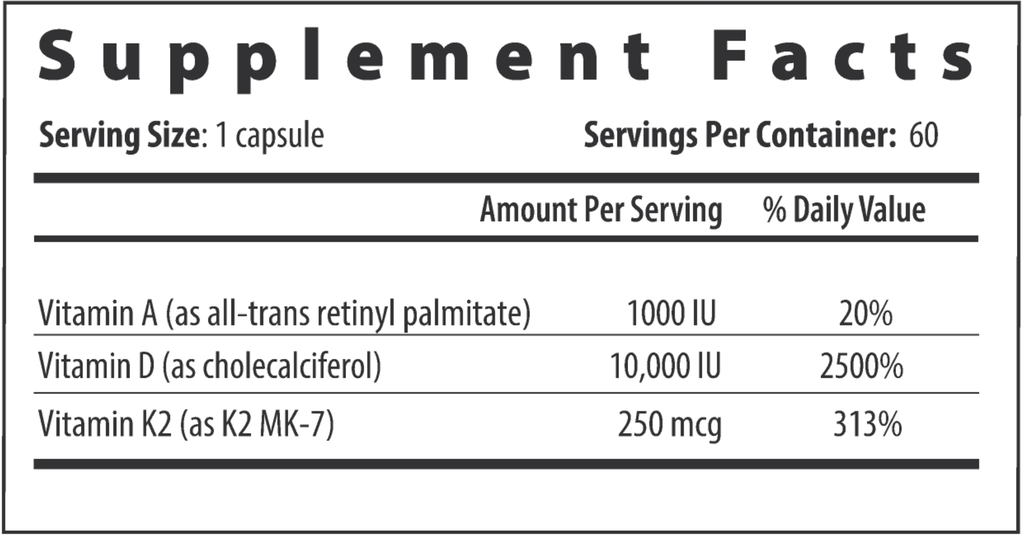 This formula provides high dose vitamin D for those who are deficient, balanced with vitamin A and vitamin K2. Vitamin D increases absorption of calcium from the intestines and vitamin K2 safely guides calcium to bones. Vitamin D and A also support immune function and D help maintain a normal inflammatory response. Vitamins A and D share a receptor, so it’s beneficial to take both for proper balance.*