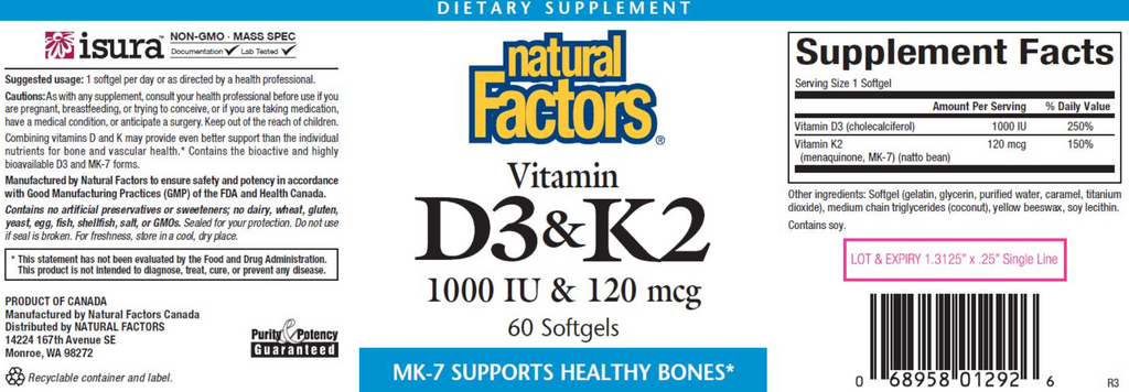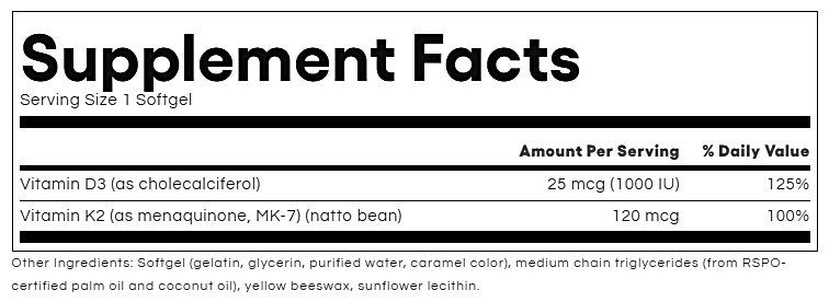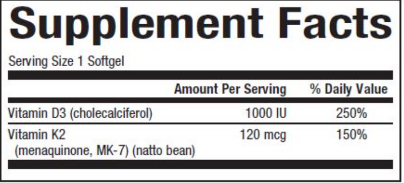 Combining vitamins D and K may provide even better support than the individual nutrients for bone and vascular health.* Contains the bioactive and highly bioavailable D3 and MK-7 forms.