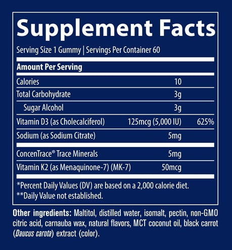 Vitamin D3 + K2 gummies are a delicious pairing of two essential nutrients that each function more effectively in the presence of the other. When combined, these two highly bioavailable ingredients help support strong and healthy bones, heart health, and immunity.*