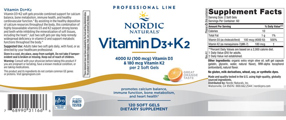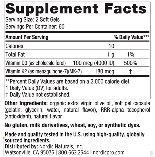 Vitamin D3+K2 soft gels provide combined support for calcium balance, bone metabolism, immune health, and healthy cardiovascular function.* By assisting in the healthy deposition of calcium resources throughout the body, this combination of highly bioavailable vitamins D3 and K2 support strong bones and teeth while reducing the mineralization of soft tissues, including the heart.* Just two soft gels per day help remedy widespread vitamin D insufficiency and support metabolic functions throughout the body.*