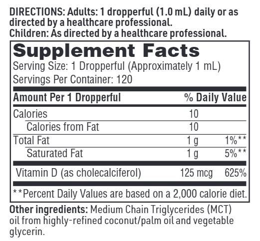 Vitamin D plays a vital role in your bone health. However, it has many other important roles too. Vitamin D receptors are widely distributed in the body, including the colon, prostate, breast, and ovary, where it acts to inhibit the excessive growth of body cells and tissues and helps cells mature normally.† Many older adults and those with malabsorption, limited sun exposure, or certain illnesses may need higher intakes of vitamin D.† Each 1 mL dropper provides 5,000 IU pure vitamin D3, formulated in hypoallergenic, easy-to-absorb medium chain triglyceride (MCT) oil.