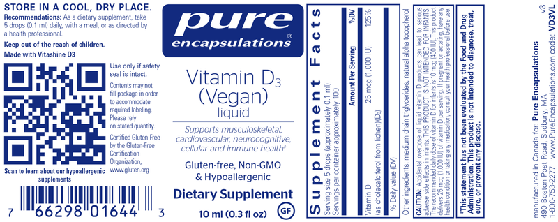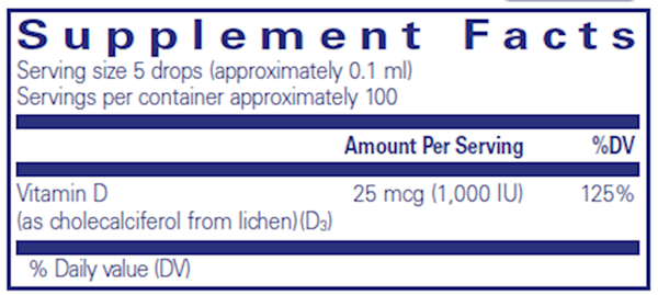 Pure Encapsulations Vitamin D3 (Vegan) liquid is derived from naturally occurring sustainably harvested lichen. It is produced through a multistep process involving extraction, purification and concentration resulting in a vitamin D3 cholecalciferol with the same molecular structure and conformation as lanolin and fish oil derived cholecalciferol.