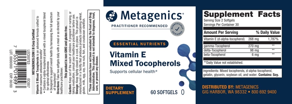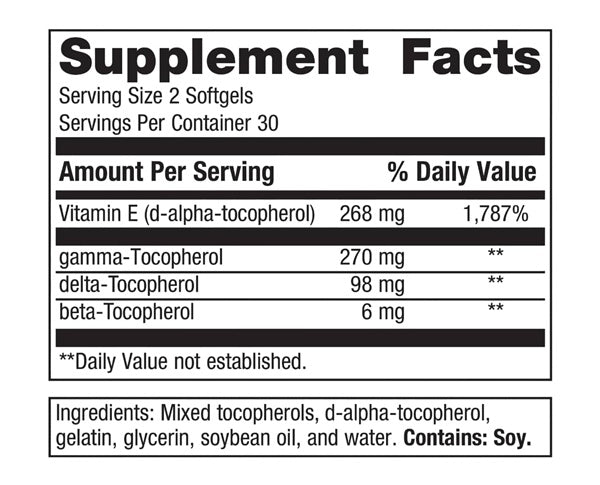 Vitamin E Mixed Tocopherols is an unesterified vitamin E formula that features d-alpha-tocopherol combined with a mixed tocopherol blend, achieving a one-to-one ratio of alpha- to gamma-tocopherols. This unique formula is designed to provide the antioxidant benefits that come from consuming a comprehensive family of tocopherols.*
