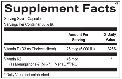 Vitamin K2 with D3 includes 45 mcg of MenaQ7® PRO, the most widely studied form of vitamin K2 as MK-7, and 5,000 IU of vitamin D3 per capsule for optimal absorption and use by the body.