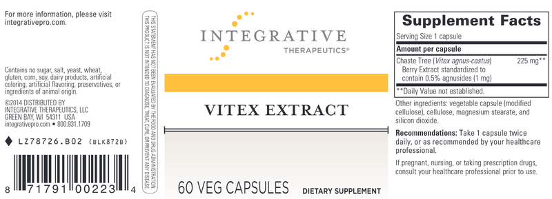 Vitex Extract is unique because each capsule is standardized to provide 0.5% agnuside, chaste berry’s most significant compound. Chaste tree berry extract is a source of phytoestrogens and a popular herb among women who need extra support during premenstrual and menstrual cycles.*