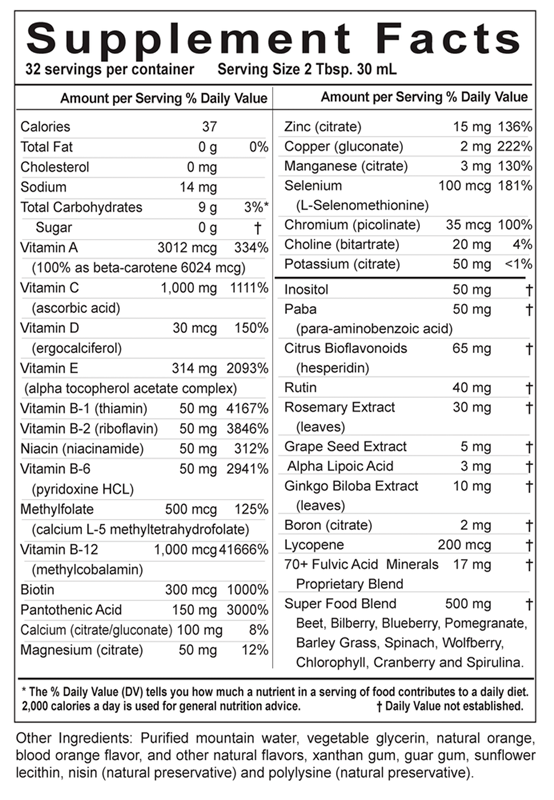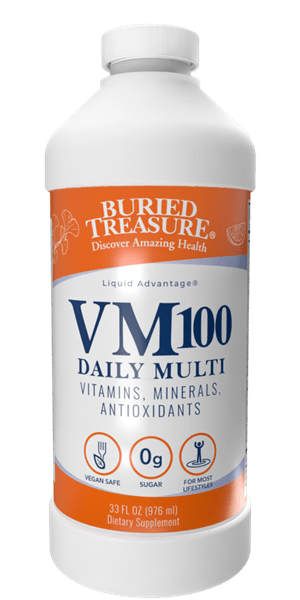 Buried Treasure™ VM100 Complete liquid daily nutritional supplement provides vitamins mineral and antioxidants in a great tasting liquid for a fast absorbing complete daily supplement. Buried Treasure VM100 Complete is non-GMO. Vegetarian safe. No gluten, wheat, dairy, or yeast. No artificial ingredients, colors, flavors or preservatives.