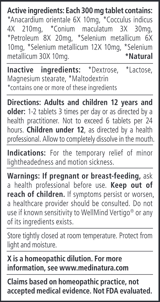 Warnings: If pregnant or breast-feeding, ask a health professional before use. Keep out of reach of children. If symptoms persist or worsen, a healthcare provider should be consulted. Do not use if known sensitivity to WellMind Vertigo® or any of its ingredients exists.