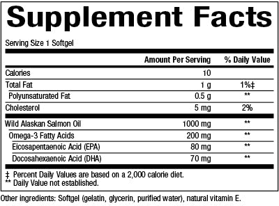 Wild salmon is a healthier choice than farmed salmon, which has been found to contain high antibiotic, PCB and dioxin levels. A source of omega-3 fatty acids and astaxanthin, wild salmon oil has a naturally occurring ratio of EPA to DHA. Wild salmon may be a better environmental choice because salmon farms can pollute coastal waters. The oil is extracted from already harvested salmon, using fish parts that would otherwise be wasted, thereby conserving existing stocks. Rigorously tested for purity, this product is guaranteed to meet or exceed the quality standards set forth by the Canadian government and the Council for Responsible Nutrition for environmental pollutants such as heavy metals, pesticides, dioxins, PCBs and other harmful compounds.