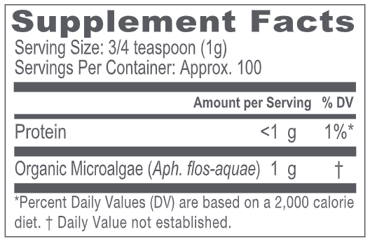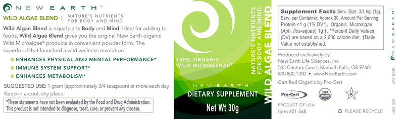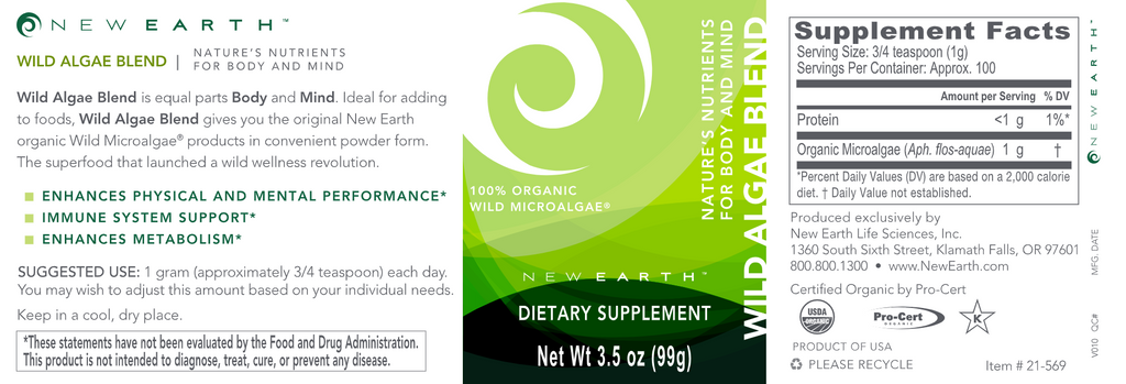 Wild Algae Blend powder is a mixture of New Earth’s specialty products: Body and Mind. A 50/50 blend of the whole Wild Microalgae® and the algae with the cell wall removed. This powder is rich in superfood nutrients.