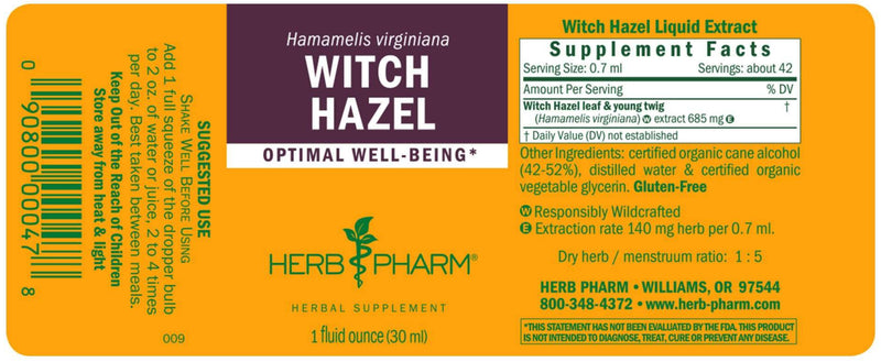 Herb Pharm prepares Witch Hazel extract from the leaf and young twigs of Hamamelis virginiana trees Responsibly Wildcrafted in the eastern US. The leaves and young twigs are harvested in summer, then dried and thoroughly extracted.