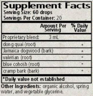 Ingredients: Dong quai, Jamaican dogwood, valerian, blue cohosh and cramp bark in a base of organic cane alcohol, mountain spring water and vegetable glycerin.