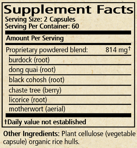 Ingredients: Dong quai, burdock, chaste tree, black cohosh, motherwort, and licorice in 100% vegetarian capsules.