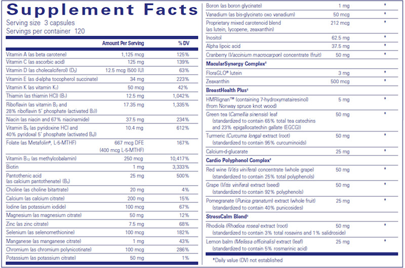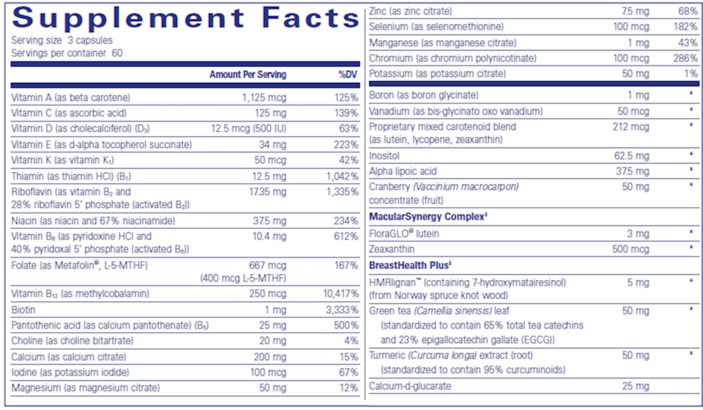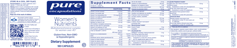 Women’s Nutrients 40+ is a multivitamin and mineral complex for women over 40 designed to support breast cell health, eye integrity, urinary tract health as well as emotional health. Women's Nutrients also helps maintain healthy blood vessel function for optimal cardiovascular health.