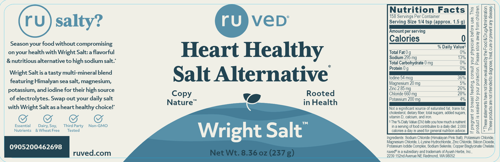 WRIGHT SALT™ is more than a healthy, tasty alternative to regular table salt. With an optimal balance of iodine, potassium, magnesium, and other minerals, this proprietary blend actually provides nutritional support for cardiovascular health. Wright Salt is an excellent choice for anyone looking to restrict sodium intake or simply take heart-healthy prevention into their own hands. Now reformulated with Himalayan Salt.