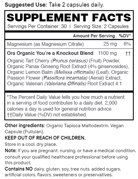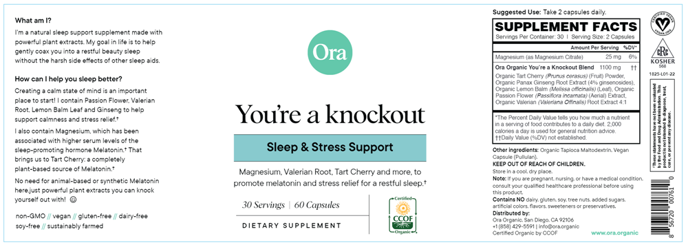 Forget the chemical sleep aids and sleeping pills that have tons of side effects. You’re A Knockout promotes better sleep and real stress relief with a blend of high-quality, plant-based and organic herbs and minerals*. Tart cherry juice provides a natural, food-based source of melatonin, valerian and passionflower are powerful sleep supporters*, and ginseng helps you handle stress better* so that you can get a long, deep, and restful night’s sleep.