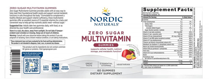Zero Sugar Multivitamin Gummies offers a tasty way for adults to complement a healthy diet and support vitamin sufficiency without sugar. Every delicious serving provides 'nutritional insurance' by delivering high-potency vitamin C, vitamin D3, vitamin B6, folic acid, vitamin B12, and a handful of other essential vitamins for daily wellness.