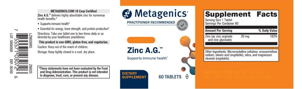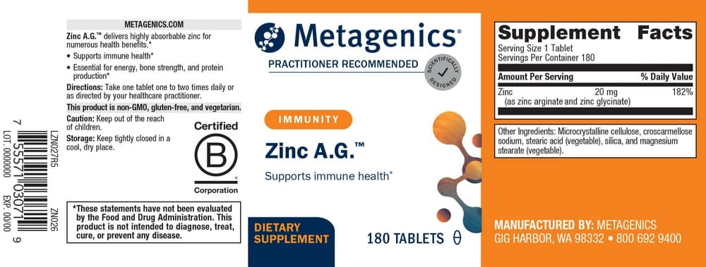 Zinc A.G.™ features zinc as an amino acid chelate with arginine and glycine designed to be highly absorbable and well tolerated. Zinc is especially important for immune and tissue health. In addition, zinc is a component of numerous enzymes in the body related to energy metabolism, bone mineralization, and protein synthesis—and plays a role in male reproductive health.*