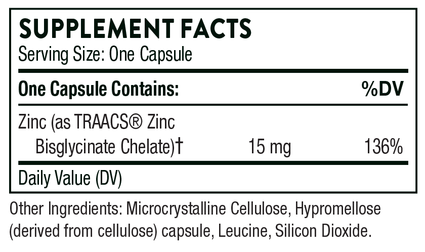 If the body has trouble absorbing a nutrient, then it can't obtain the nutrient’s benefits. Thorne offers two highly absorbable forms of zinc: Zinc Picolinate and Zinc Bisglycinate. Zinc Picolinate is zinc that is bound to the organic acid picolinic acid, which is naturally made in the body from the amino acid L-Tryptophan. Zinc Bisglycinate is zinc that is bound to two molecules of the amino acid glycine – creating a true amino acid chelate.
