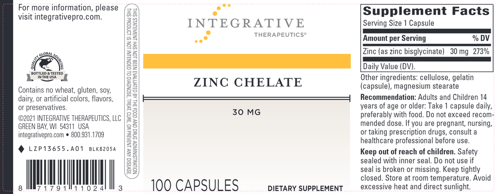 Zinc Chelate is formulated with an advanced chelate complex for optimal absorption within the body. Our product is carefully produced, tested, and bottled to superior quality standards in the USA. Zinc Chelate is gluten-free with no wheat, soy, dairy products, or artificial colors, flavors, or preservatives.