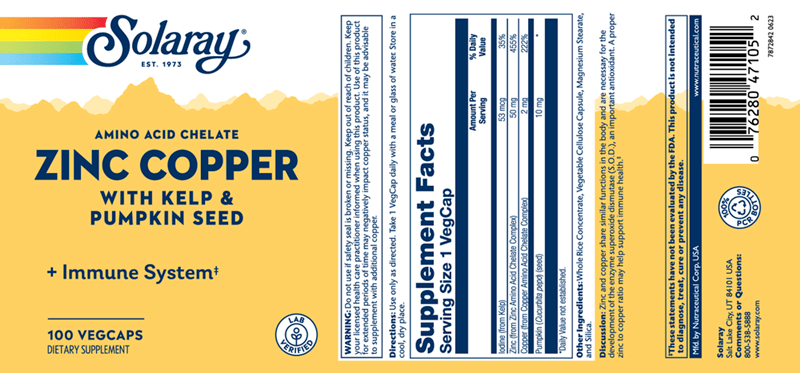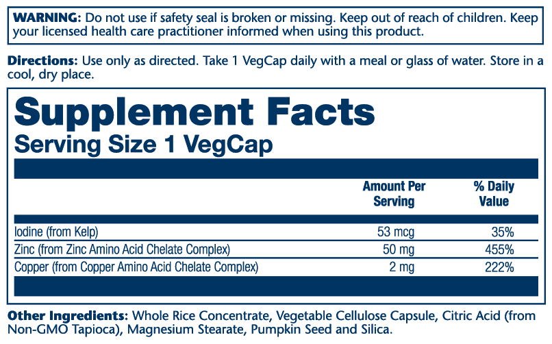 Zinc and copper share similar functions in the body and are necessary for the development of the enzyme superoxide dismutase (S.O.D.), an important antioxidant. A proper zinc to copper ratio may help support healthy cellular and circulatory health. The minerals in this product are reacted with aspartic acid, whole rice concentrate, citric acid and glycine to create a more absorbable chelated complex.