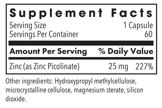 Zinc Picolinate provides 25 mg of elemental zinc per capsule of highly bioavailable zinc to support immune resilience, mental clarity, mood, and reproductive health.* This form of zinc has demonstrated superior absorption compared to other forms such as citrate and gluconate, making it ideal for individuals with increased needs or limited digestive capacity.*