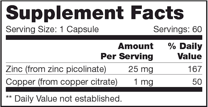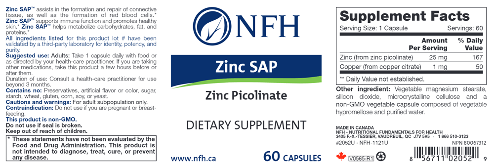 Zinc SAP contains a highly absorbable form of zinc, called zinc picolinate. Zinc is a mineral that is essential in both innate and adaptive immune function. Zinc is also important to maintain connective tissue formation, intestinal health, and healthy skin. In addition, metabolism of carbohydrates, fat, and proteins to form red blood cells relies on zinc for proper function.* Long-term supplementation of high doses of zinc can result in copper deficiency, which is why a small dose of copper is included in Zinc SAP to prevent potential deficiency.