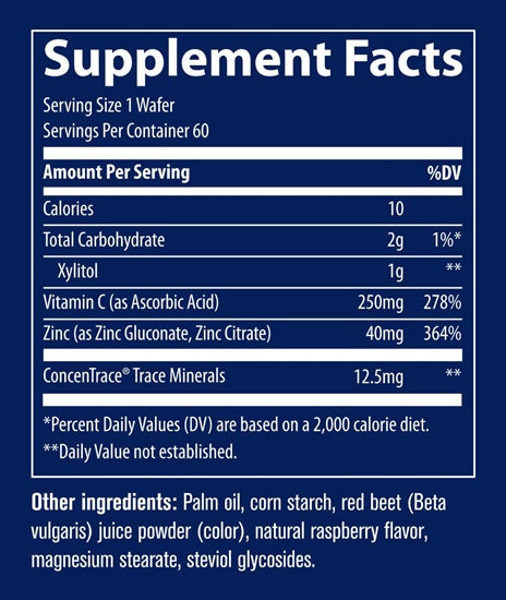 Zinc is a necessary trace element that helps support a healthy immune system, participates in over 100 enzyme reactions, and supports healthy growth and development. Vitamin C is an essential vitamin that helps boost the immune system and has strong antioxidant properties.